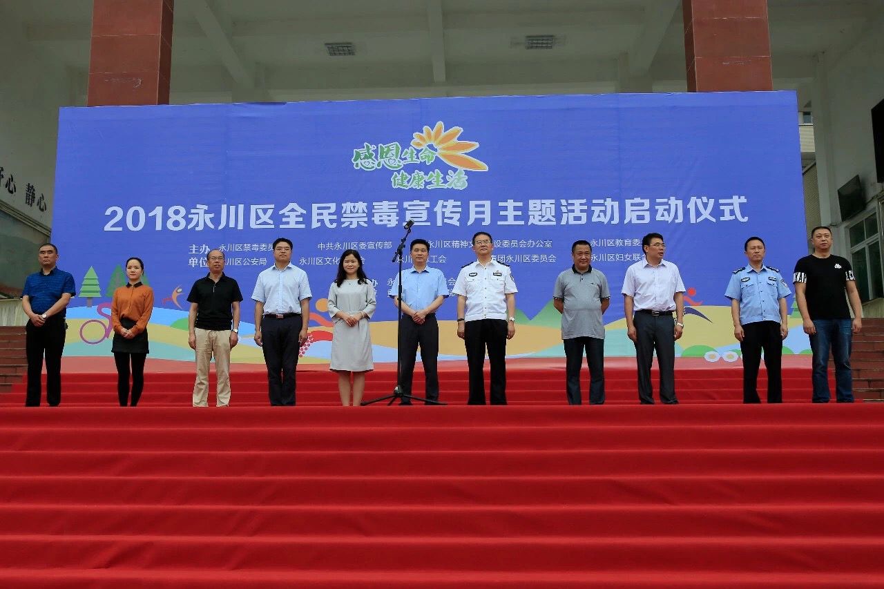 6月13日上午,由永川区禁毒委、区委宣传部、区文明办、区教委、区公安局、区文化委、区总工会、团区委、区妇联联合组织开展的“感恩生命·健康生活——2018年永川区全民禁毒宣传月”主题活动启动仪式在学院举行,这标志着为期一个月的全民禁毒宣传月主题活动正式拉开序幕。区委常委、政法委书记、区禁毒委主任罗晓春,副区长、区公安局局长、区禁毒委副主任刘建中,学院副院长文斌、刘仲全出席启动仪式并讲话。