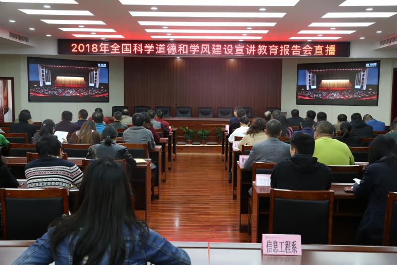 2018年10月15日下午15:00,主题为“以习近平新时代中国特色社会主义思想为引领,大力弘扬新时代中国科学家精神和爱国奋斗精神”的2018年全国科学道德和学风建设宣讲教育报告会在人民大会堂举行。学院组织全体科级以上干部,专任教师及校内兼课教师,各系部教学秘书,组织人事处、科研与发展规划中心、教学工作部相关工作人员在博学馆510会议室集中收看报告会同步直播,学院党委书记刘波,院长江洪,副院长梁先勇、文斌、刘仲全,纪委书记朱传书出席。
