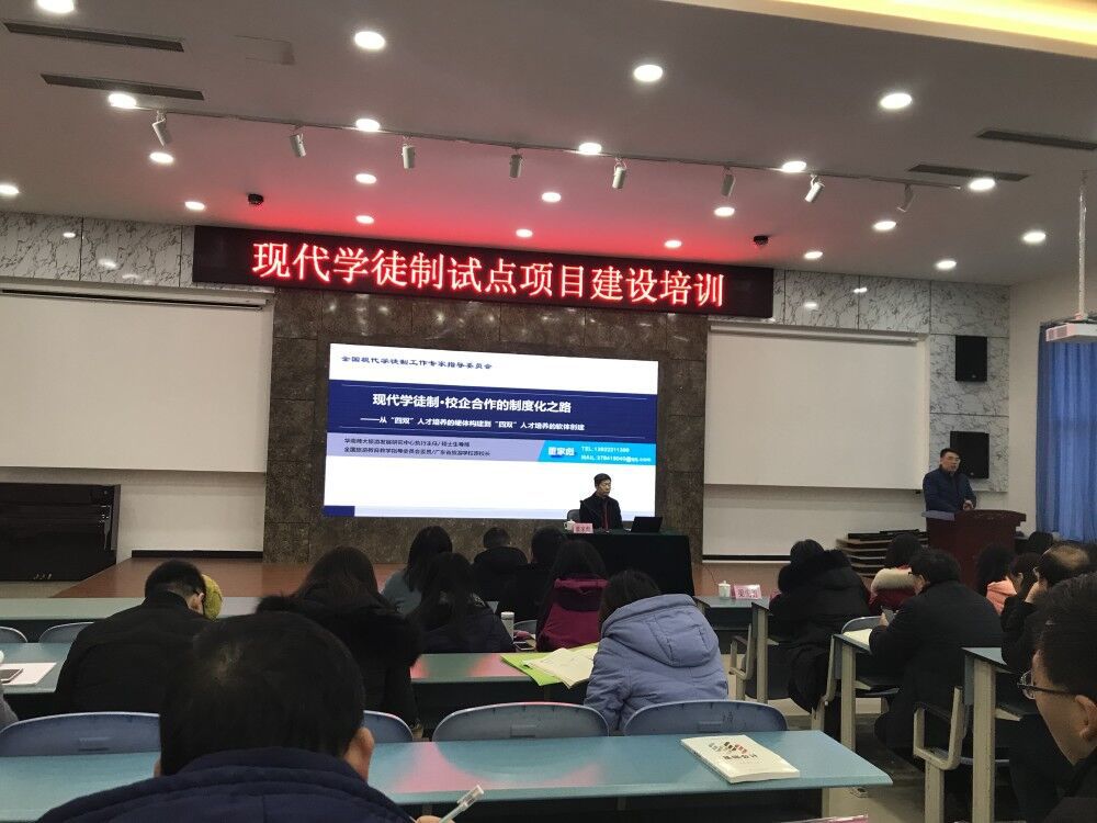 1月16日至17日,学院特邀教育部现代学徒制专委会专家、华南师大旅游发展研究中心执行主任董家彪教授,重庆城市管理职业学院连锁经营管理专业带头人邱云副教授、重庆工程职业技术学院徐小姗副教授以及超星集团技术团队到校进行现代学徒制和信息化教学专题培训。学院领导、全体教职工参加培训。