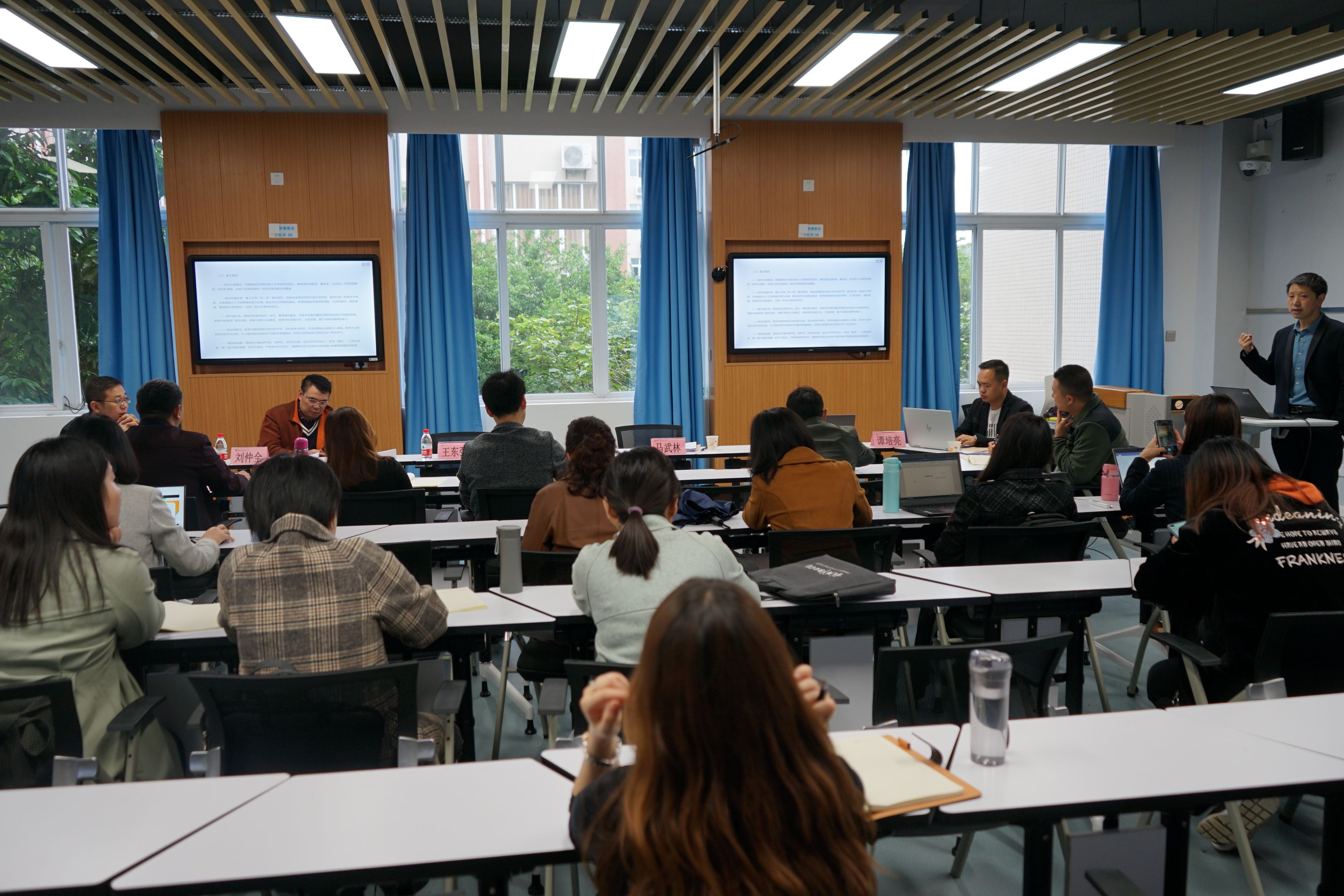 马武林教授等2名校外专家还对教师说课点评指导,并与一流课程申报团队教师展开交流讨论。