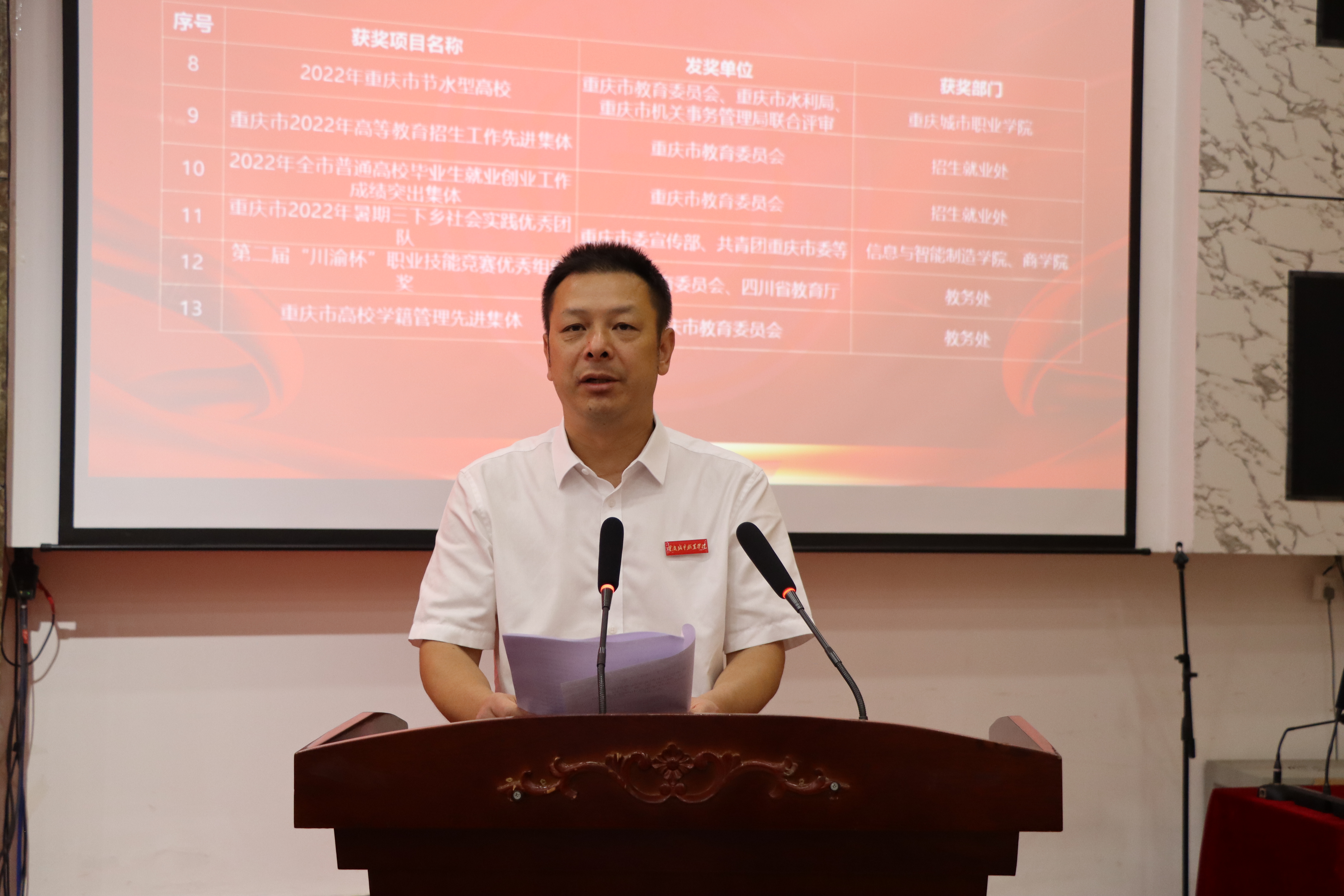 党委委员、副校长刘仲全宣读《关于表彰2022-2023学年度“城市匠星树人奖”荣誉称号的决定》。