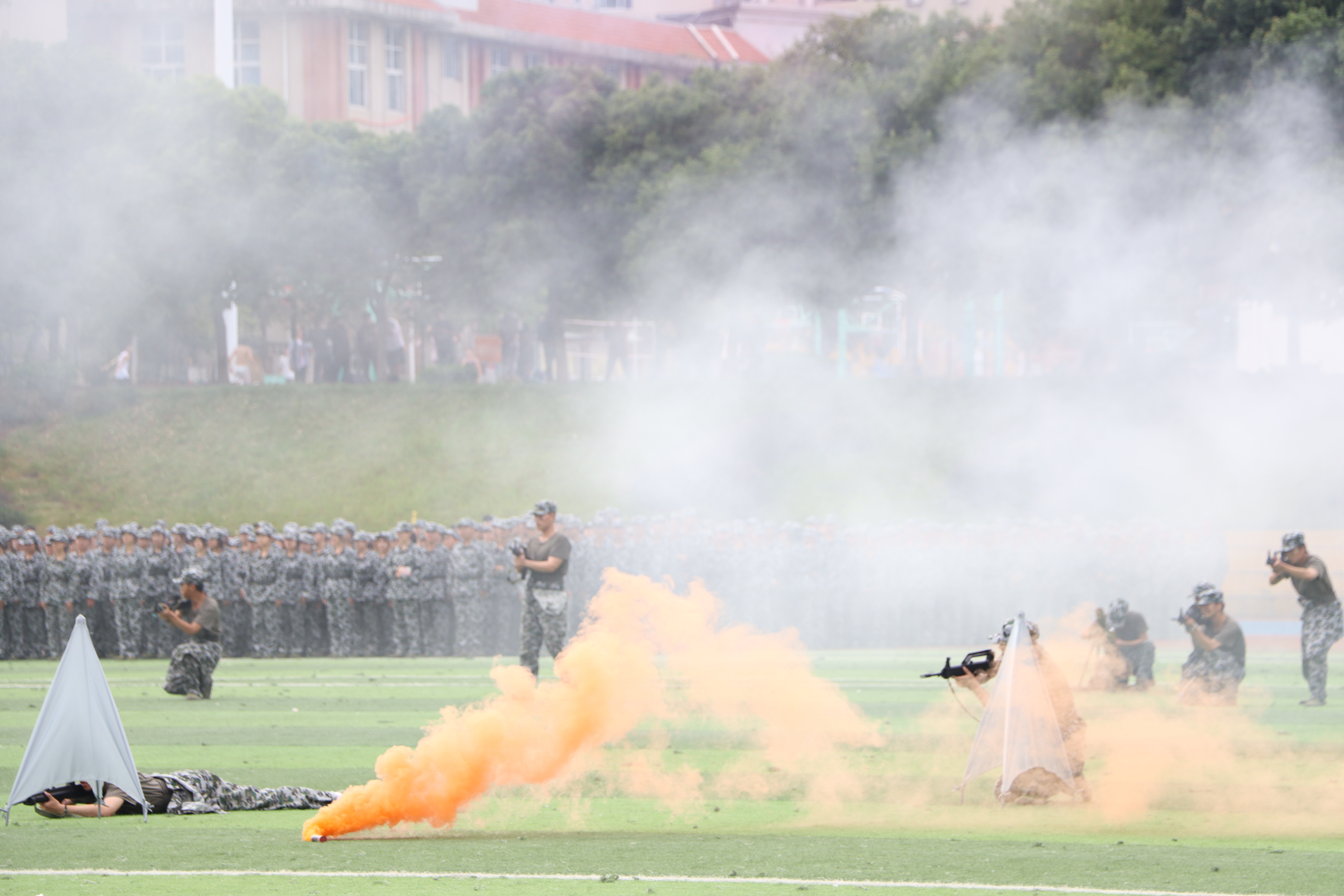 分列式后,参训学生先后进行队列变换、匕首操、军体拳、战术表演等训练汇报演出。