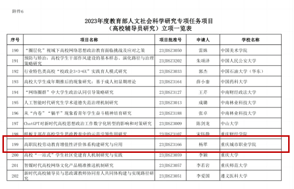 近日,教育部社科司公布了2023年度教育部人文社会科学研究专项任务项目(高校辅导员研究)评审立项结果,做爱视频 商学院教师杨翠主持的《高职院校劳动教育增值性评价体系构建研究与应用》获批立项,实现做爱视频 教育部高校辅导员研究专项任务项目零的突破。